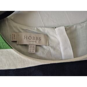 The Hobbs London Designer Colorblock Linen Ives Sheath Dress in size 10 is a stylish and colorful option for casual occasions during the summer and spring seasons. This sleeveless dress features a round neckline and a zip closure, with wide straps adding a touch of elegance. Made of woven linen, the dress showcases a vibrant multicolor pattern in a short sheath style, making it a standout piece for any woman's wardrobe. With the reputable brand of Hobbs, this dress is sure to bring both fashion and flair to any outfit.