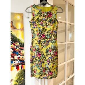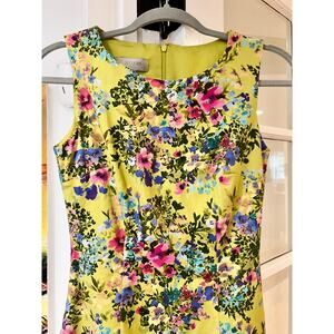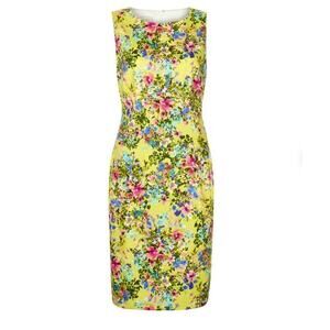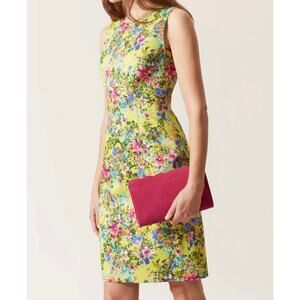 Elegant Hobbs London floral sheath dress in vibrant yellow with pink and blue blooms. Sleeveless with a tailored silhouette, this chic dress is perfect for spring weddings, garden parties, or office wear. Classic Hobbs craftsmanship with a flattering fit that transitions seamlessly from day to night. A timeless wardrobe staple for any season.