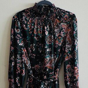Elevated and feminine, this Hobbs London limited edition blouse features a rich dark green base with an intricate multicolor floral pattern. Designed with a smocked high neckline, long sleeves, and a tie waist for a flattering silhouette. Crafted from lightweight, fluid fabric that drapes beautifully.