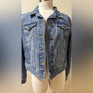 Hobbs blue denim jacket with button closure. Features classic stitching and pocket details. US Size 10/UK Size 14.