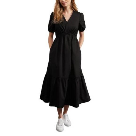 Hobbs London 'Meadley' Black Cotton Limited Midi Dress Size 2: a classic style, this midi dress features short sleeves, v neck and a pocket, measurements: 16 inch bust x 47 inch length.