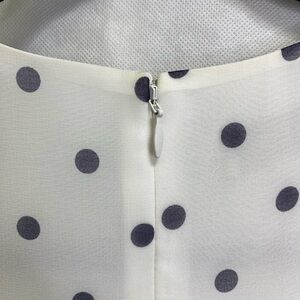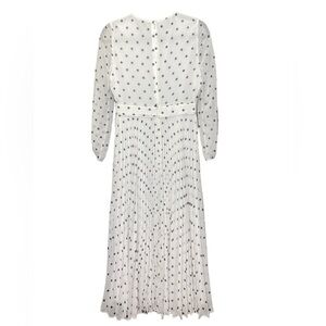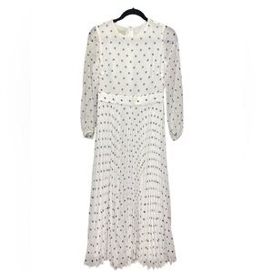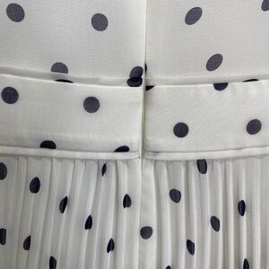 17” pit to pit 13-1/2” waist 13-1/2” shoulder to shoulder 49” OAL Excellent preowned condition Round neck Semi-sheer three-quarter puff sleeves, button cuffs Fit-and-flare silhouette Banded waist Pleated skirt Back concealed zip closure Allover dot print Lined body