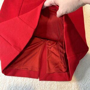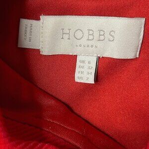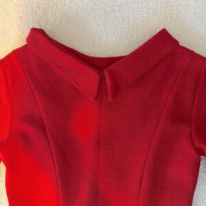 This beautiful red Hobbs London sheath dress has a reverse point-collar design to draw attention both coming and going. The dress has a roll neck, three quarter length sleeves, and front and back seam details. There is a concealed back zip closure as well as a back vent at the hem. It is crafted from ottoman jersey with a textured finish (with a touch of spandex for stretch) and is fully lined. This dress is in very good pre-owned condition and has been freshly cleaned.