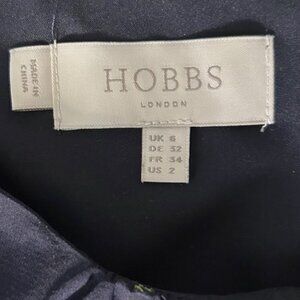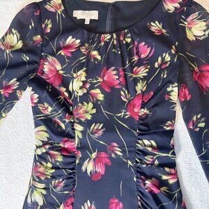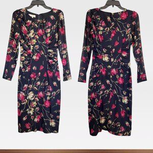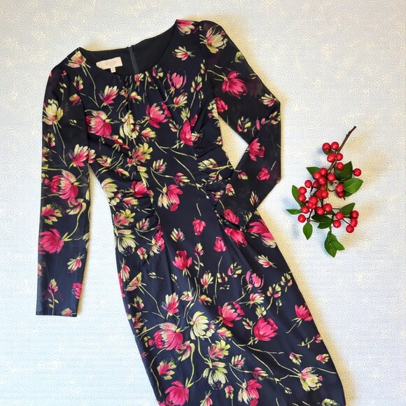 This beautiful silk blend dress by Hobbs London has a pink tulip print against a navy blue background. The dress is tailored to be body skimming but with a bit of elastane for stretch and gentle ruching in front. It is partially lined with sheer long sleeves and has a concealed zip back closure and a back vent. This dress is in overall very good pre-owned condition.