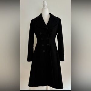 A chic black wool coat featuring a double-breasted design, with sleek, sharp lines that enhance its structured silhouette. The coat is crafted from soft, warm wool, perfect for colder weather, and its princess-style cut cinches at the waist, flattering the figure with a slightly flared bottom. The elegant double-breasted front showcases a row of polished buttons, adding a touch of sophistication. The design gives off a refined yet timeless vibe, with a slightly tailored fit that enhances the coat's feminine shape.