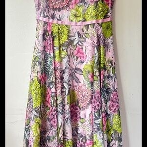 Let beautiful florals bloom in your occasionwear collection. Featuring an intricate hand drawn floral print designed in Hobbs' London atelier, this dress comes in a sleeveless silhouette with a feminine flared midi skirt that is sure to turn heads. With a grosgrain ribbon trim to emphasise your waist.