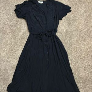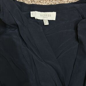 Hobbs navy blue button downed dress with tie across waste. This is like a blouse type dress. There is no patternrn. It’s just in need a a good press. Like new. Size 12