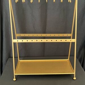 Stylish gold rack for organizing jewelry. Ideal for necklaces and bracelets. Keeps accessories tidy and visible. Measures 13 inches tall and 10 inches long.
