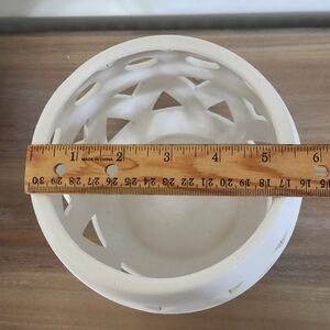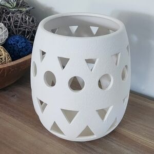 While likely not safe for real candles or open flame, this piece is ideal with a battery-powered LED pillar candle (not included)—giving off a beautiful, warm glow through its cut-out pattern.