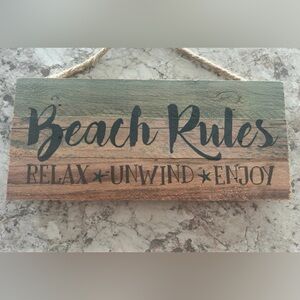 New, never used. Hobby Lobby Hanging Beach sign. With the saying Beach Rules: relax, unwind, enjoy. Perfect for any coastal or beach themed room.