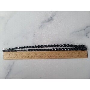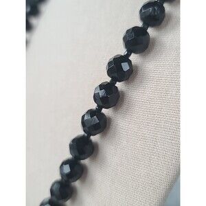 This is a vintage faceted black glass beaded adjustable necklace with a gold tone metal hook closure.