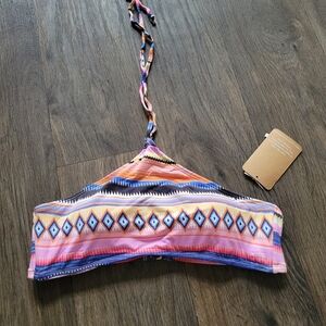 Vibrant bikini top with geometric patterns. Features a mix of pink, blue, and orange hues. Perfect for a stylish beach day.