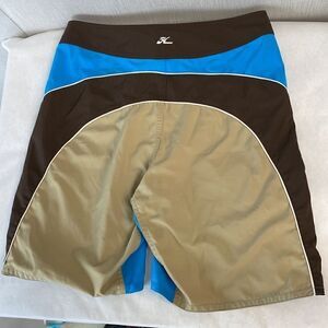 Hobie vintage Mens swim shorts in size 32. Brown, tan, and blue with white trim. Velcro and drawstring closure. Zip pocket with interior loop string on one leg. Great condition. Ships fast from a smoke free home.