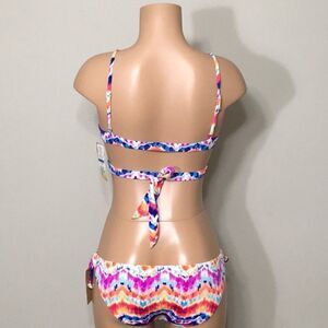 An abstract chevron print in punchy tones take this wrap swim top to new style heights. Equally functional as it is fashionable.