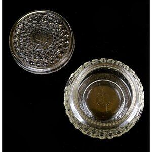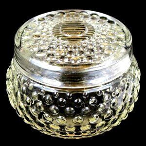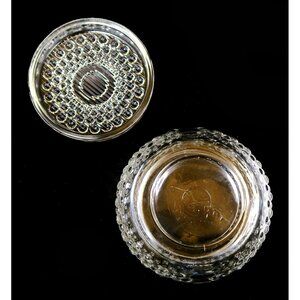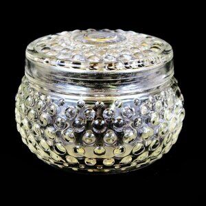 Listed here is a hobnail clear glass lidded trinket box, featuring the distinctive Dot Dash pattern. Measuring approximately 3.75 inches tall, this elegant, covered jar showcases ribbed detailing on the underside of the lid, adding a refined touch to its design.