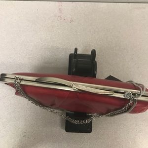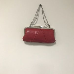 This classic leather clutch is great for all occasions. This color is described as garnet which is a color in the pink family The finishings are silver which gives the clutch its uniqueness!