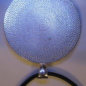 The necklace is a black leather cord style and measures 24" with an additional 2'' extension chain.