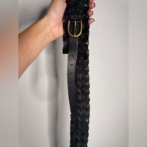 Black braided leather belt with brass hardware that adds boho-chic edge—distressed patina tells a story of adventures, adjustable for custom fit. Perfect for cinching dresses, jeans, or tunics; your timeless, versatile accessory for effortless, bold accessorizing!