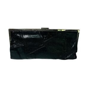 This bold and stylish long clutch wallet by Hobo International features black leather with snakeskin-textured patchwork and a vintage-inspired kiss lock clasp. It offers a roomy interior with multiple card slots, bill compartments, and a zippered pocket, making it both eye-catching and functional. The structured silhouette and statement textures make it a standout piece for any collection. The wallet is in gently used condition with light wear from age and use, but all zippers and closures are fully functional. Perfect for fans of vintage glam and bold fashion.