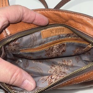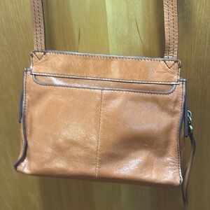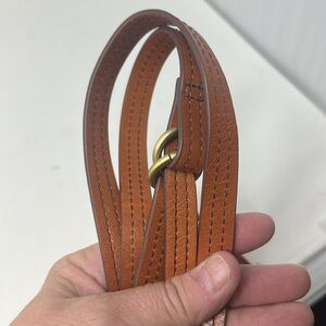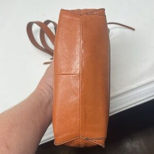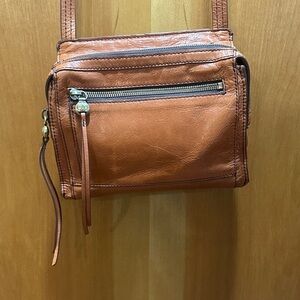 Preowned. In great shape. It has a top zip closure for security, along with an adjustable shoulder strap that offers a drop of approximately 21-26 inches. The exterior design includes two front zip pockets and a signature phone pocket on the back, while the interior is lined with luxurious sandalwood and offers three slip pockets and one zip pocket for organized storage. The bag measures approximately 10.5" W x 7.5" H x 2.5" D