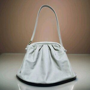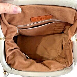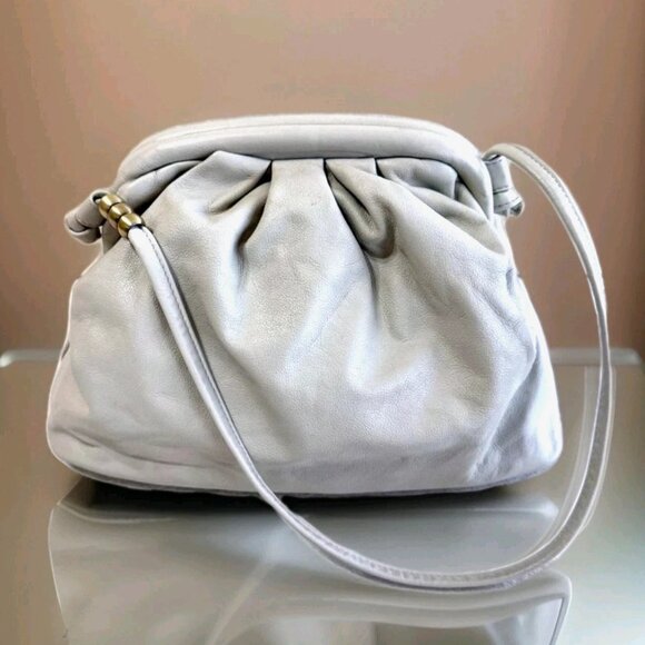The Hobo Adalyn Frame Light Gray Leather Shoulder Bag has a sleek rectangular shape and solid gray exterior. The bag features a super soft subtle leather exterior, a strong magnetic closure and gold hardware accents. The shoulder strap handle is made of gray leather. The interior is lined with brown cotton fabric and includes multiple inner pockets for organization. This beautiful bag is in excellent condition.
