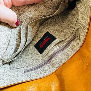 Stylish yellow/mustard leather clutch bag with a sleek design. Perfect for any occasion.