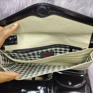 The Hobo International Black Patent Leather Black Beige Canvas Clutch Handbag is a stylish and versatile accessory for women. Featuring a solid rectangular shape with a magnetic closure, this medium-sized clutch is perfect for various occasions such as parties, casual outings, or formal events. The exterior is made of patent leather and canvas in classic black, with gold hardware accents. The interior is lined with beige canvas and includes inner pockets for organization. Additionally, this designer clutch comes with a mirror for added convenience. The lightweight design and sleek black patent leather handle/strap make it a chic choice for everyday use.