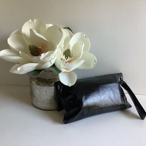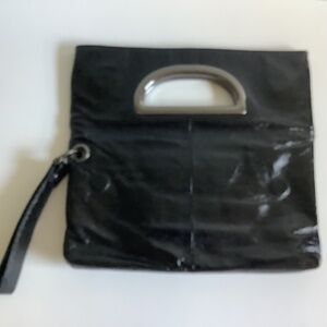 HOBO INTERNATIONAL black patent leather clutch with a metal handle is a handbag featuring a front flap with a magnetic closure and gunmetal-tone hardware. The interior is fully lined and has two slide-in pockets, six card slots, and one zip pocket. It is also known as a clutch, wristlet, or foldover bag.