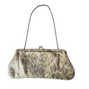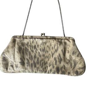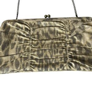 Hobo International Vtg. Frame Bag Clutch Chain Kiss Lock Leopard Print Tan Gold