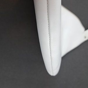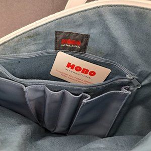 Hobo International White Shoulder Bag Asymmetrical Minimalist Design. The Bag has a large zipper top compartment on each side with a middle section which has a magnetic closure and a small slip pocket. One large zipper compartment has slip pockets, pen/lipstick pockets and a small zipper compartment; the other side has 2 slip pockets. Unique design. It is preowned and has wear and marks/stains. Interior has dark stains on the upper rims and has "1997" in marker written on it. The exterior has some light marks/scuffs- please see pictures.