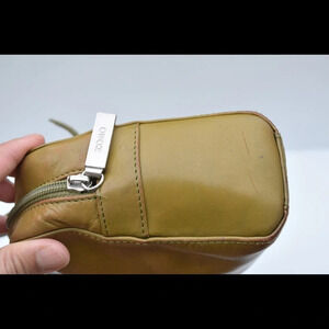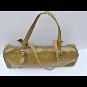 Hobo international shoulder bag. Measured 14" x 5 1/2" shoulder drop 6". All leather with silver tone hardware. Zip hardware with hobo logo embossed. Olive green color.Zip closure. Zip & side pockets inside.. minor wear to bag lining, wear to bottom corners of the bag(pic)