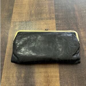 Upgrade your accessories with this timeless Hobo wallet featuring soft black leather with an elegant embossed floral pattern. Designed with a classic kiss-lock closure, this wallet is both stylish and functional, offering ample space for your essentials.