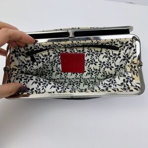 HOBO Lauren Clutch Wallet in Black - Hobo's most sought-after double frame wallet style. This wallet is not only a fashion statement but a lasting investment in style and quality. Soft suede like leather outer with an almost metallic like sheen. Wear this tucked in your tote as a wallet during the day and turn it into an evening bag style clutch at night! Hidden Magnet Closure: Combines security with seamless accessibility. Exterior Front: Zip pocket; Exterior Back: Bill pocket, slip pocket & 6 credit card slots for easy organization. Interior features a zip pocket, ID holder & 3 credit card slots for maximum functionality. Fun black and white floral interior print. Smartphone-Friendly: Accommodates your smartphone, making it the ideal all-in-one accessory. Excellent used condition, very faint mark towards bottom, glue discoloration on interior fabric from manufacturing process (both pictured). Approximate measurements: L 8.5" x H 4.5" x D 1"