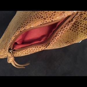 Rich snake print leather. Features top zipper closure, shiny nickel hardware, single strap design and an exterior zip pocket. Interior features a back walk zip pocket, slip pocket, 2 cell pockets and a pen pocket, with grosgrain lining. 17.5"W x 9"H x 1"d