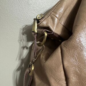 SUPER SOFT LEATHER IN TAN WITH BRASS HARDWARE, SIDE POCKET, INTERIOR POCKETS