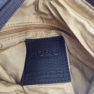 Elegant HOBO bag with black leather interior label. Classic tan lining.