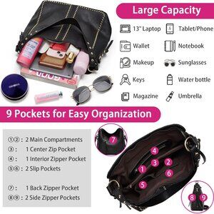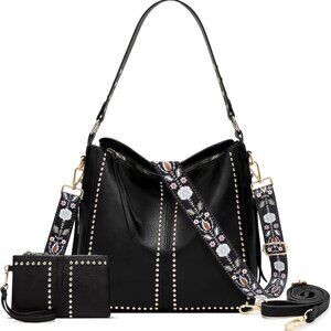 Features: Spacious tote with a sleek black faux leather exterior, adorned with subtle gold-tone studs for a modern vibe. Includes a matching zippered pouch, perfect for your wallet, makeup, or cards. Designed with removable crossbody straps—switch from shoulder to crossbody effortlessly—and complemented by a fun floral-printed boho strap for a casual twist. Multiple pockets inside and out help keep your essentials organized, fitting most 13-13.5" laptops and daily must-haves.