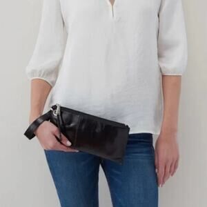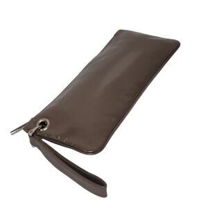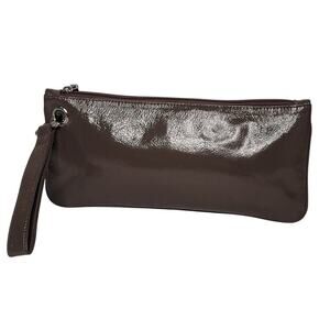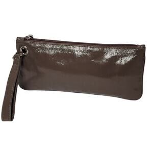 A Gray patent leather wristlet from Hobo. Stock photo to show size. Large enough to carry phone and essentials.