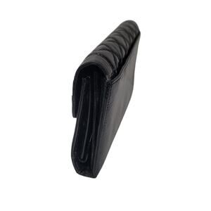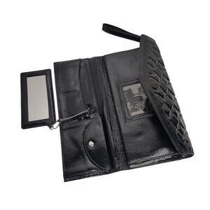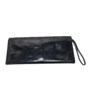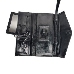 Smooth soft black patent leather, front has a quilted flap with magnetic closure, back has a wide slip pocket with magnetic close, hidden strap pulls out for use as clutch or wristlet, inside has lots of pockets, coin pouch, ID slot, card slots, and an attached mirror, lining is a black and white check pattern, Hobo, closed 11”x5”, good condition