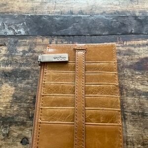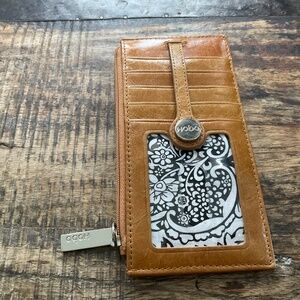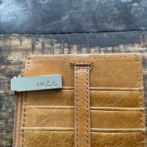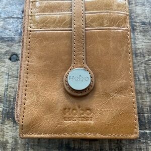 Distressed tan leather card holder.Silvertone snap close on front and back.12 compartments inside,one has a zipper.Black and white design linen fabric inside.Excellent like new condition.The brand is HOBO. All closures work.6 1/2 /3 in.Fast ship!