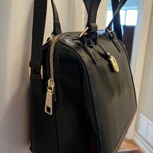 Hobo black polished leather handbag with permanent shoulder strap. Originally $198. Used, excellent, clean condition. Full zipper top with one outside open pocket. Gold hardware. Orange fabric interior with one zip pocket and three open pockets. Dust bag. Hand strap 6 inch drop, shoulder strap 14 inch drop. H 8.5 in, W 9.0 in, D 4 in.