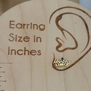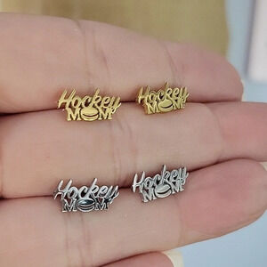 Stainless steel Hockey Mom with puck on hypoallergenic posts.