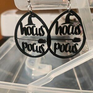 Stylish black earrings with 'Hocus Pocus' design. Perfect for Halloween or themed events. Lightweight and easy to wear. Can be made with Silver or Gold hardware.