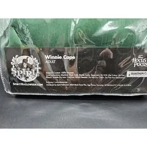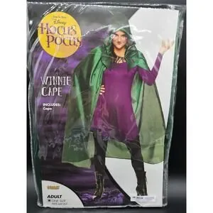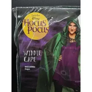 This product is a Hocus Pocus Halloween costume inspired by Winifred Sanderson's cape with hood. The costume is in green color and features the iconic style from the Hocus Pocus theme. It is designed for adult size, fitting most with its one size concept. Perfect for Halloween celebrations, this officially branded Disney costume is sure to make a magical statement for any fan of the spooky and whimsical.