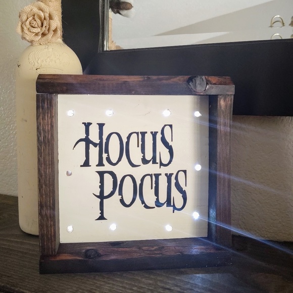 Perfect for Halloween! Hocus Pocus themed frame that has battery operated lights. Perfect for the fireplace mantle or any shelf in your home! Sturdy. Had some weight. I hand make these! I am open to offers but will decline or counter if the price is too low. Approximately 9" squared.