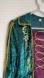 Emerald green velvet costume dress with celestial moon and sun gold trim details. Features a deep plum underskirt with sheer ruffles and a purple lace-up front with gold cording. Ideal for cosplay events, themed parties, or theatrical productions.