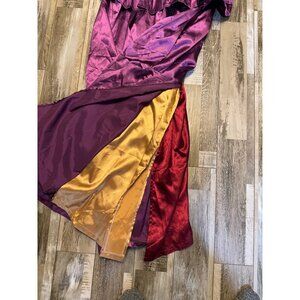 This Hocus-Pocus women's costume dress showcases a vibrant fusion of red and purple satin with elegant lace-up details and puffed sleeves. Designed for comfort and style, the dress offers an enchanting look for themed parties or events. The XL size ensures a comfortable fit for various body types.