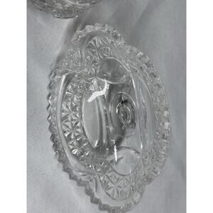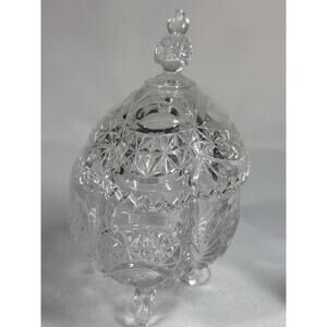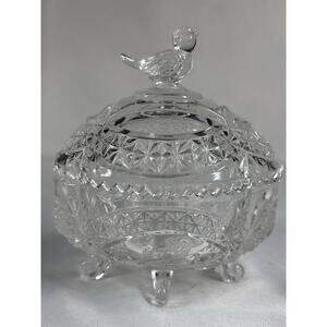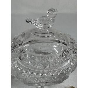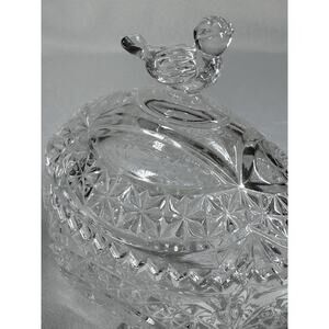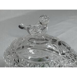 The Hofbauer Byrdes Bird Finial Lead Crystal Candy Dish Trinket Box and Small Ornament is a vintage set handmade in Germany by the renowned brand Hofbauer. This round, clear crystal dish features a bird finial and comes with a lid, making it perfect for storing candies or trinkets. The glossy finish and intricate bird theme add a touch of elegance to any decor. The set includes 2 items and should be hand washed only to maintain its original beauty. Made in a classic cut glass production style, this candy dish is a beautiful and charming addition to any collection.