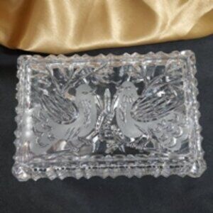 This large lidded crystal box has deep ridges and facets on all sides including the bottom. The lid has two satin etched love birds or doves. The box is 6 "long x 4" wide x 3" tall.