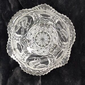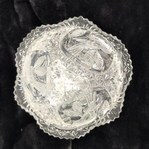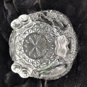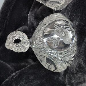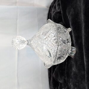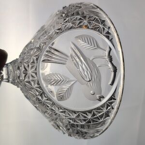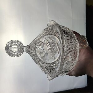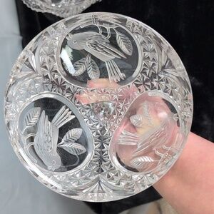 Elegant crystal candy dish with intricate bird design. Features a decorative lid and footed base.